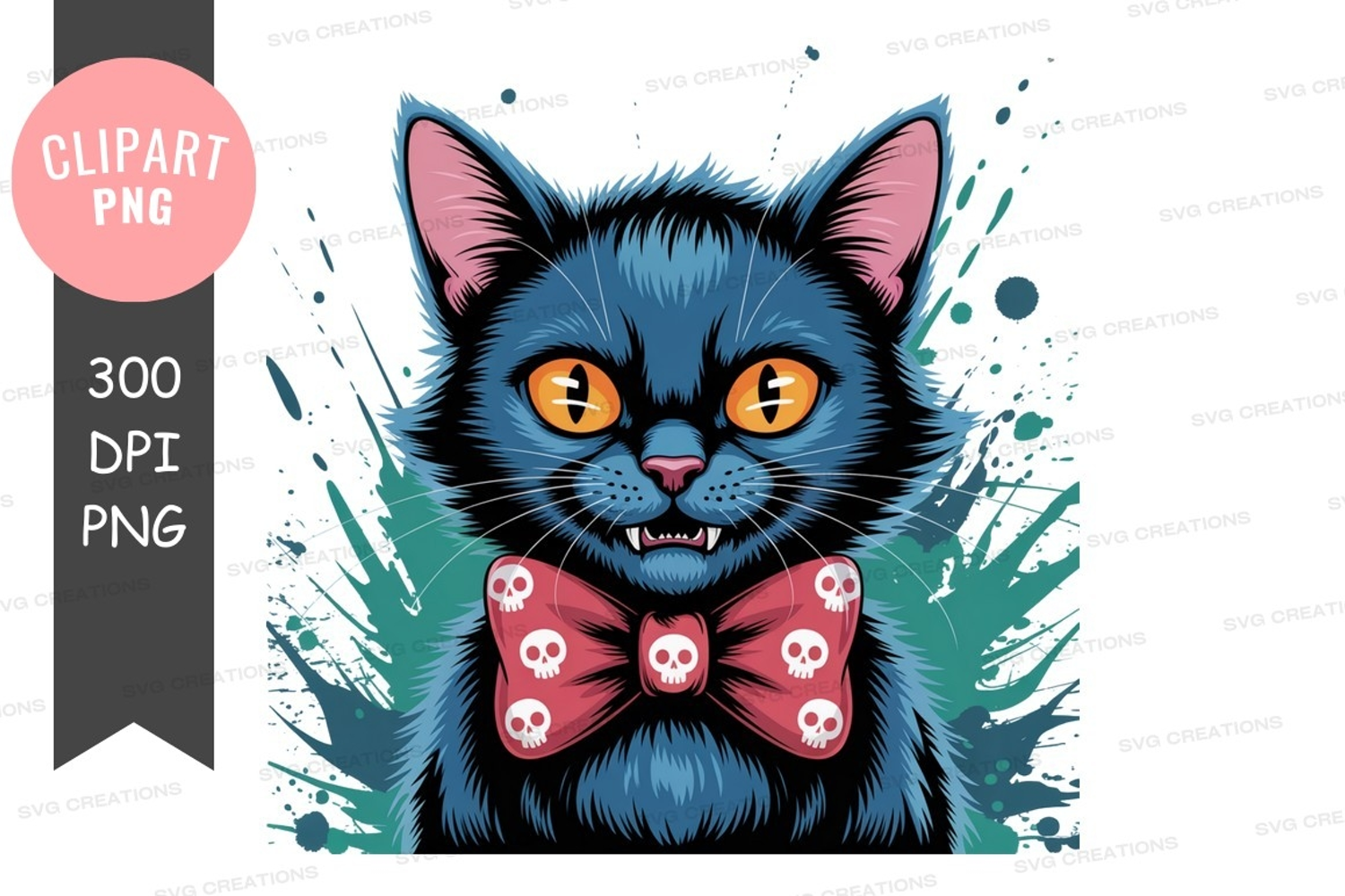 Skull Cat Black Cat Bowtie Funny Cat Colorful Background Cartoon Cat Orange Eyes Mischievous Cat Veye