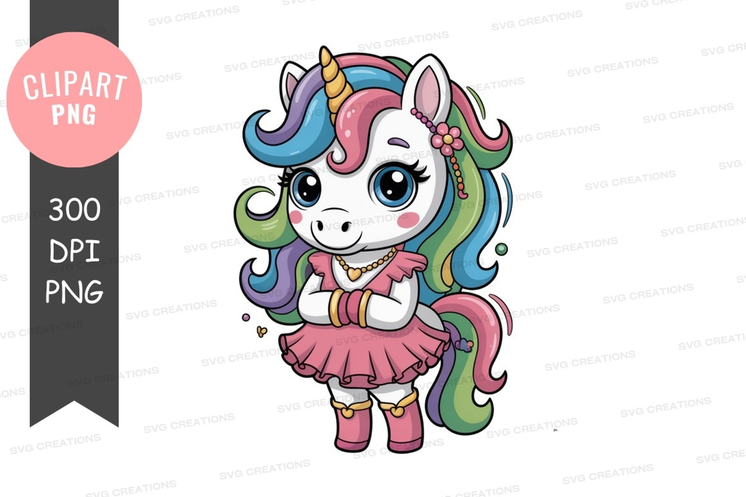 A Whimsical Illustration Of A Cartoon Unicorn With Multicolored Hair And A Pink Tutu The Unicorn Has Including A Necklace And Bracelets