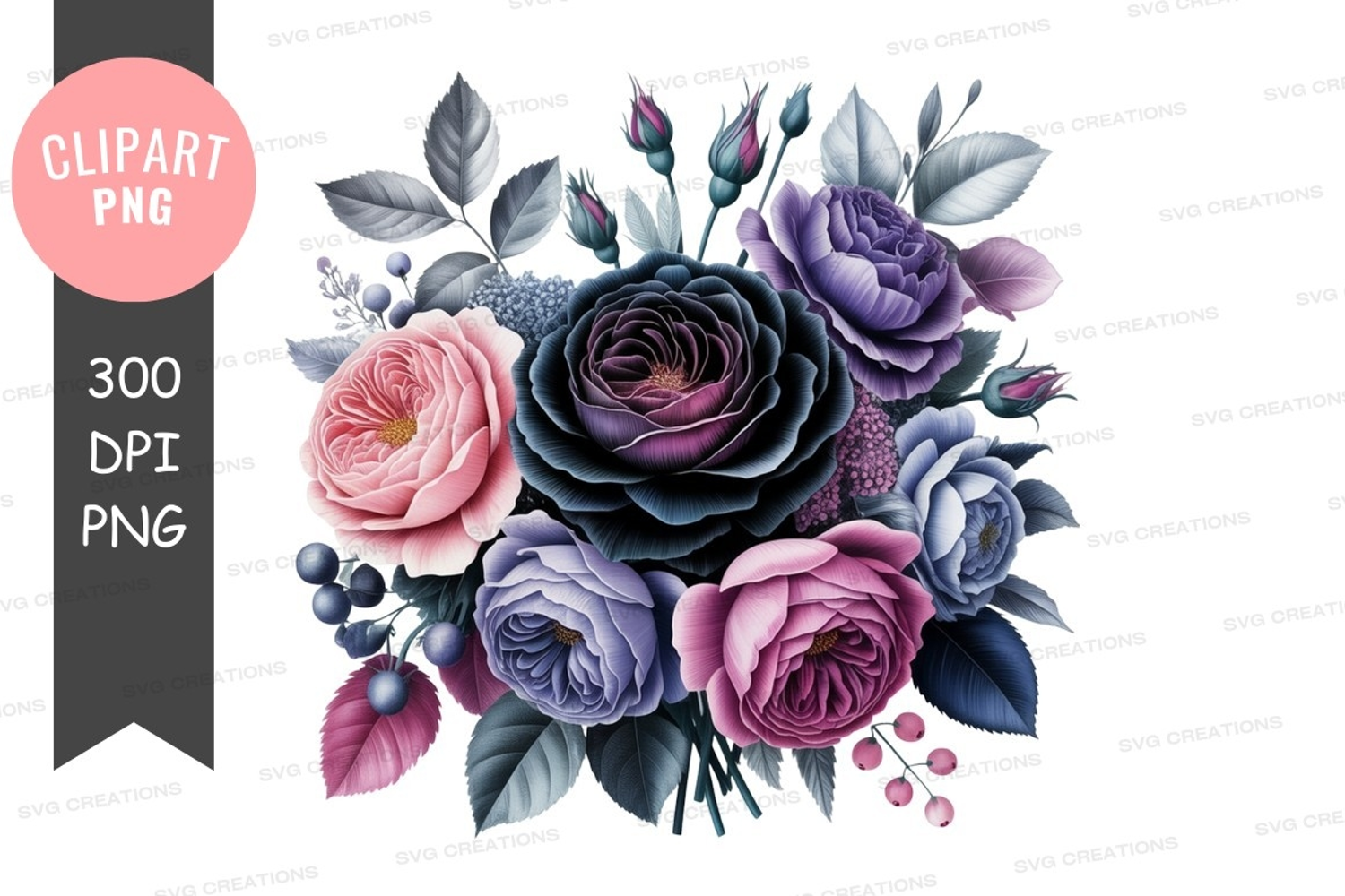 Purple And Blue A Beautifully Arranged Bouquet Of Flowers Featurin Complemented By Green Leaves And Berries