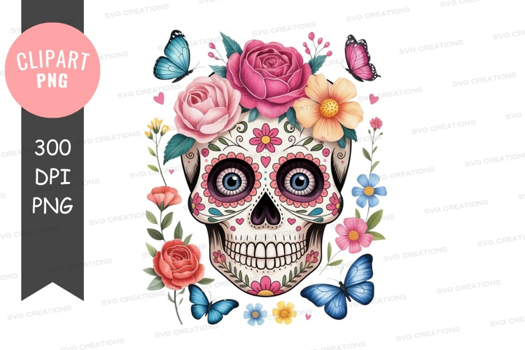 Vibrant sugar skull with flowers and butterflies clipart png example image 1