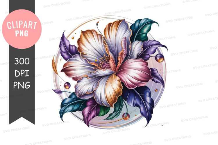Illustration Green Flower Leaves Purple Orange White Petals Circular Frame Water Droplets