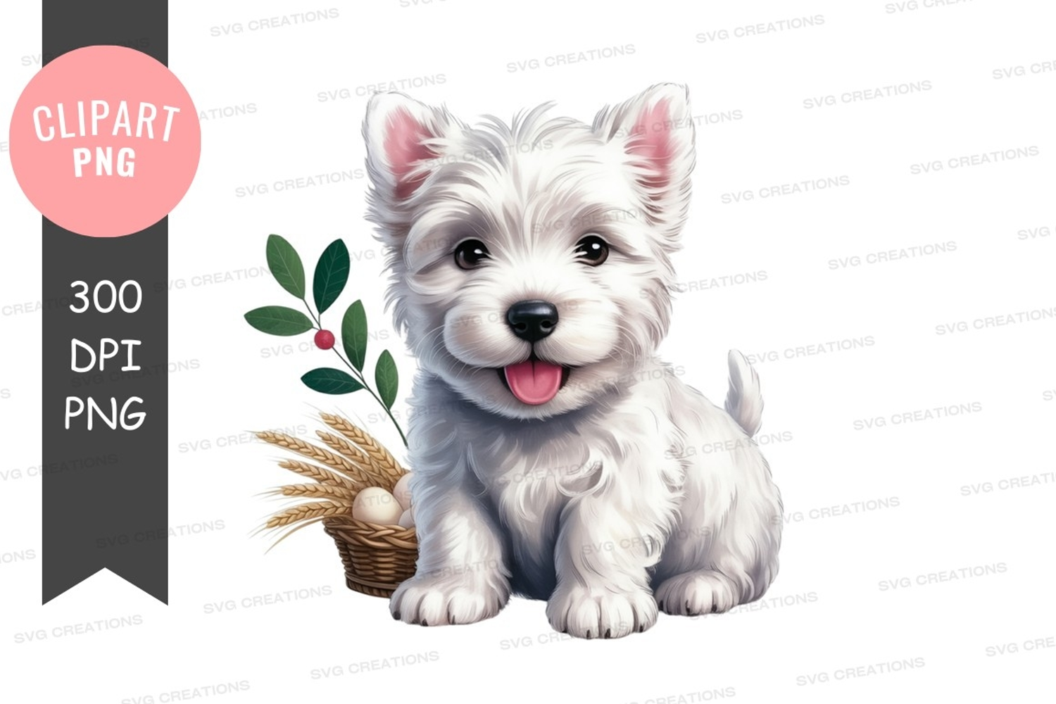 Illustration Cartoon Happy Wheat Leaves Berries Puppy Dog Basket West Highland White Terrier