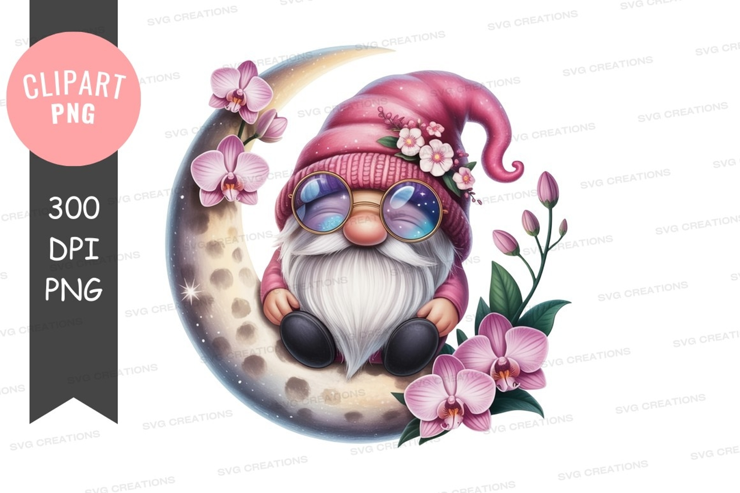 Illustration Fantasy Whimsical Flowers Orchids Moon Sunglasses Gnome Crescent Moon Pink Hat
