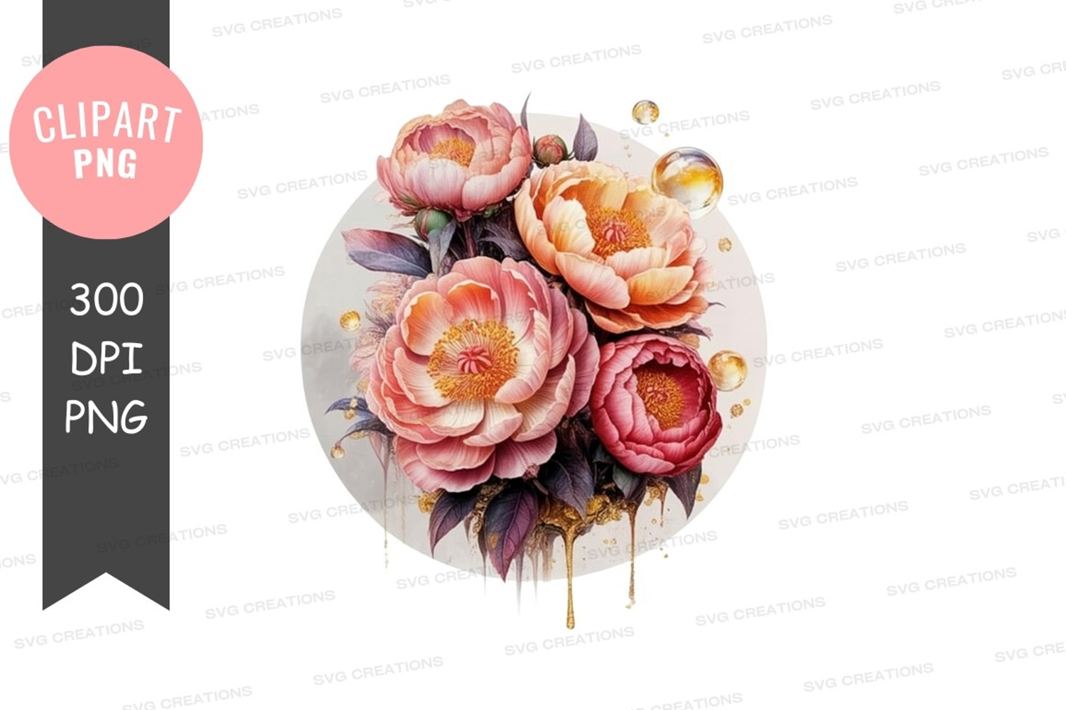 Illustration Art Nature Flowers Leaves Peonies Bouquet Transparent Background Gold Accents Dripping Effects
