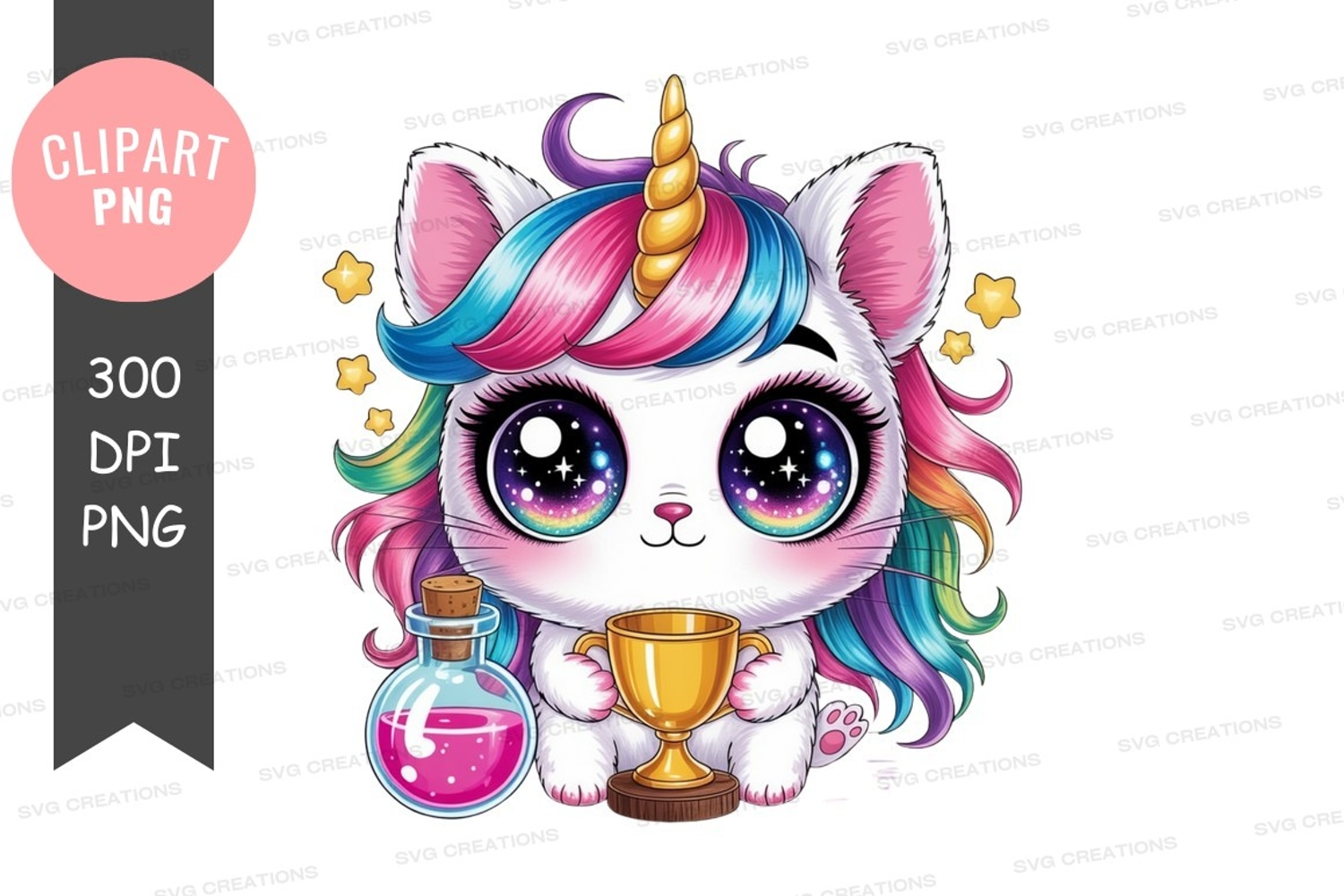 Illustration Fantasy Colorful Cat Unicorn Stars Magical Potion Trophy