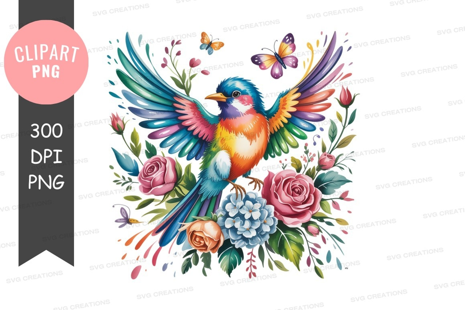 Colorful bird with flowers and butterflies clipart png example image 1
