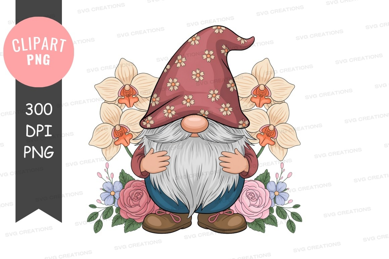 Similar Design Products to Cheerful gnome with flowers clipart png