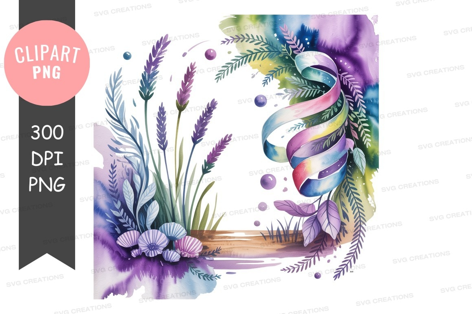 Decorative Watercolor Floral Artistic Flowers Lavender Garden Frame Butterfly Ribbons