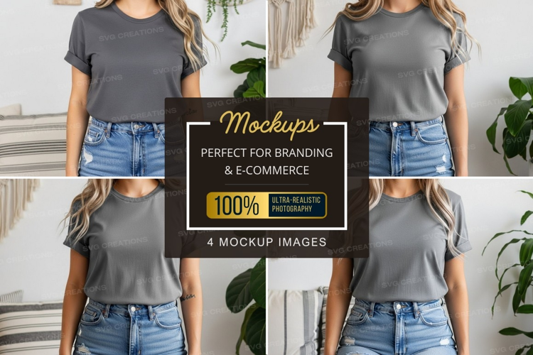 Fashion T-shirt Mockup Front View Gray Side View Back View Outfit Denim Shorts Casual Wear