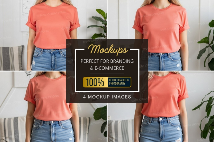 T-shirt Mockup Model Coral T-shirt Design Green Plants Denim Shorts Minimalist Background Distressed Jeans Striped Cushions