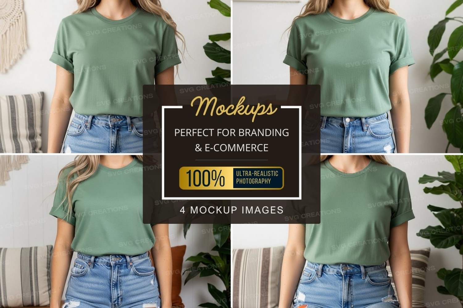Fashion T-shirt Mockup Jeans Front View Side View Back View Sage Green Women's Clothing Casual Wear