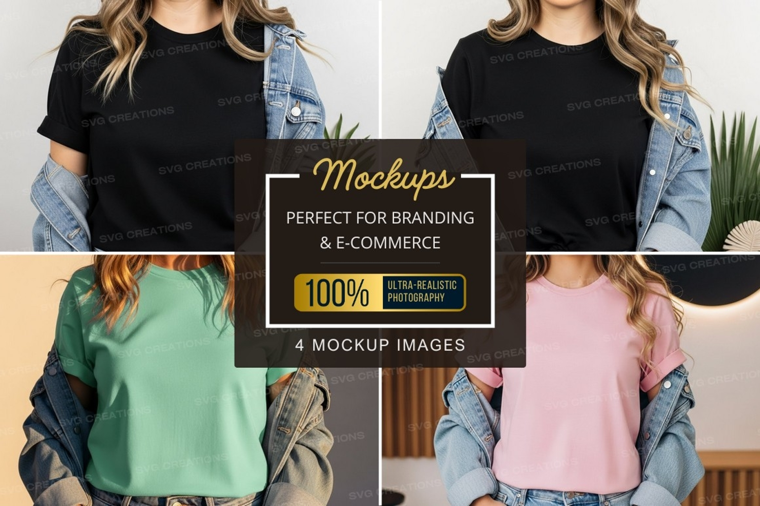 Fashion T-shirt Mockup Apparel Modeling Black T-shirt Casual Wear Denim Jacket Green T-shirt Pink T-shirt