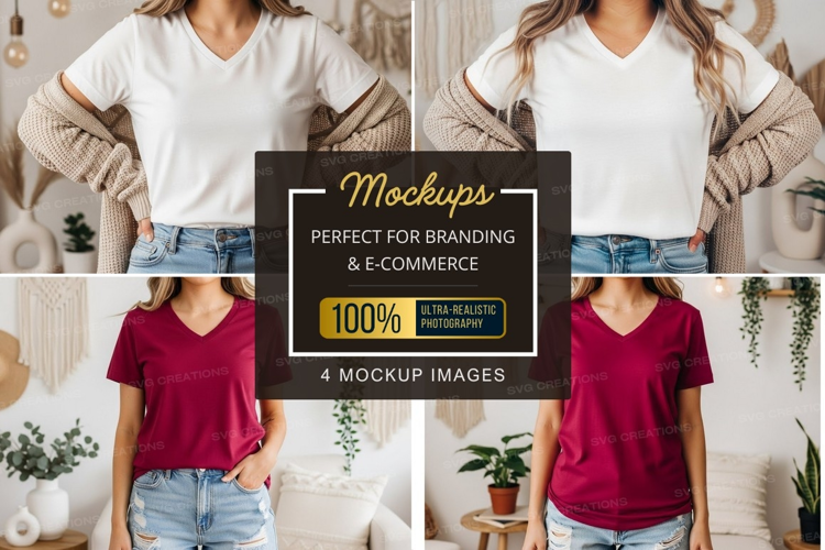 Fashion T-shirt Mockup Plants Bohemian Macrame White T-shirt Denim Shorts V-neck Maroon T-shirt