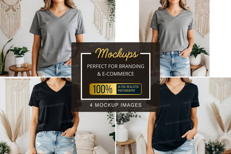Fashion T-shirt Mockup Jeans Denim Shorts Black T-shirt Gray T-shirt V-neck Casual Wear