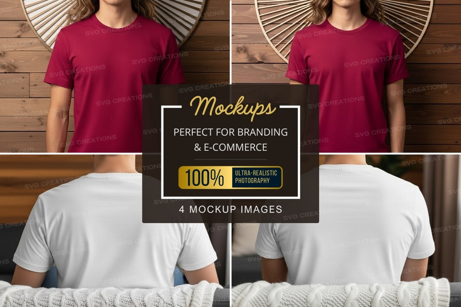 T-shirt Mockup Front View Back View Decorative Elements Wooden Background White T-shirt Red T-shirt