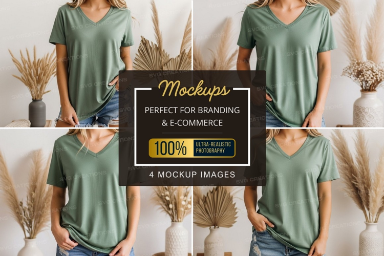 Fashion T-shirt Green Mockup Woman Background Jeans Vases V-neck Dried Plants