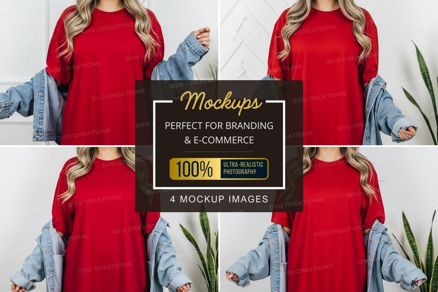 Fashion Mockup Model Plant Geometric Background Long-sleeve Denim Jacket Red T-shirt