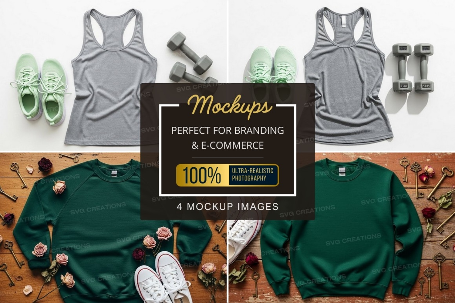 T-shirt Mockup Roses Sneakers Sweatshirt Tank Top Dumbbells Casual Wear Wooden Surface Athletic Wear