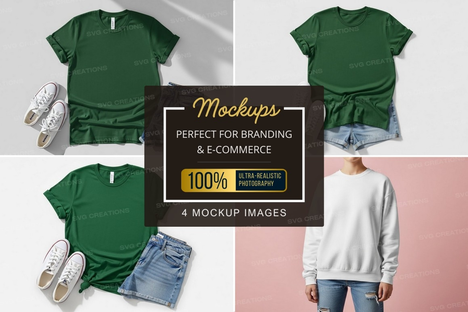 T-shirt Mockup Jeans Outfit Sneakers White T-shirt Denim Shorts White Sweatshirt Green T-shirt