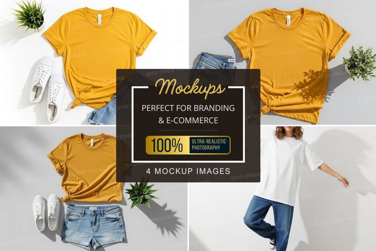 T-shirt Mockup White Greenery Sneakers Summer Fashion Mustard Yellow Bright Background Denim Shorts Casual Wear