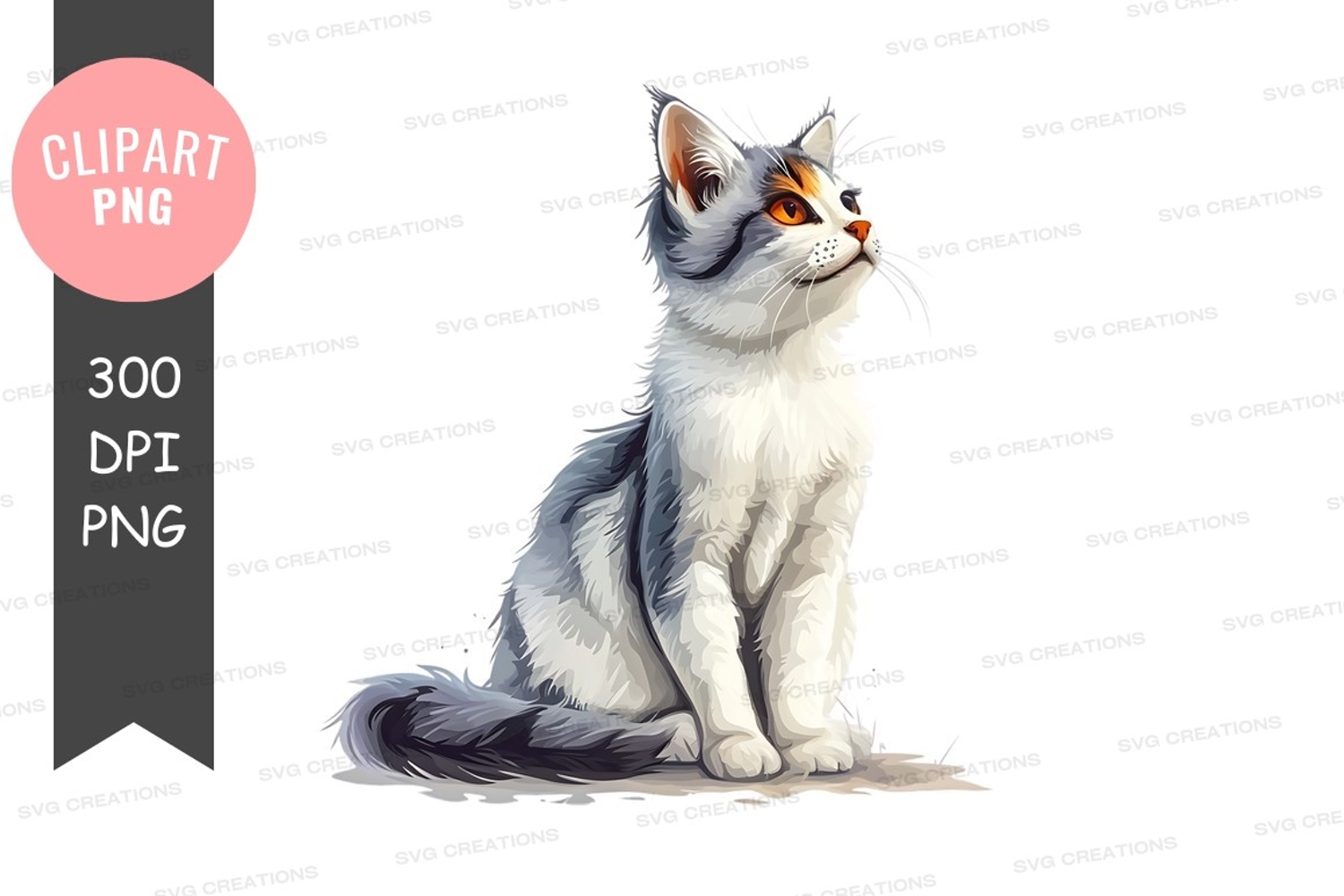 Illustration Elegant Clipart Sitting Cat White Gray Feline Orange Eyes