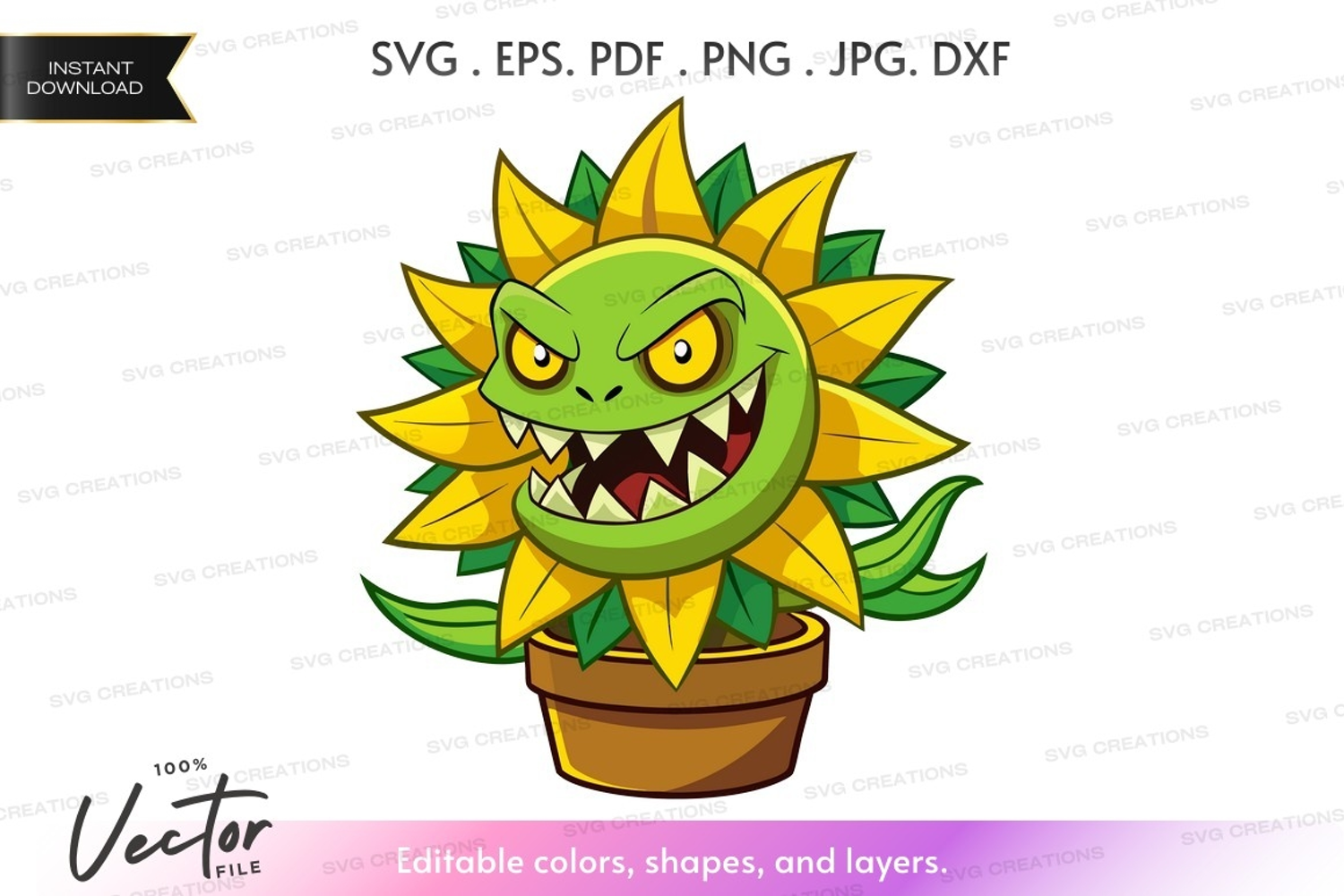 Cartoon Vector Angry Silhouette Face Teeth Pot Sunflower