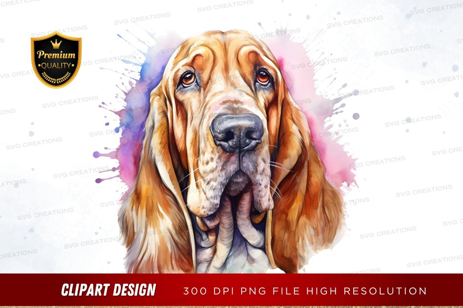 Watercolor Pink Purple Blue Portrait Dog Basset Hound Colorful Background Sad Expression Droopy Ears