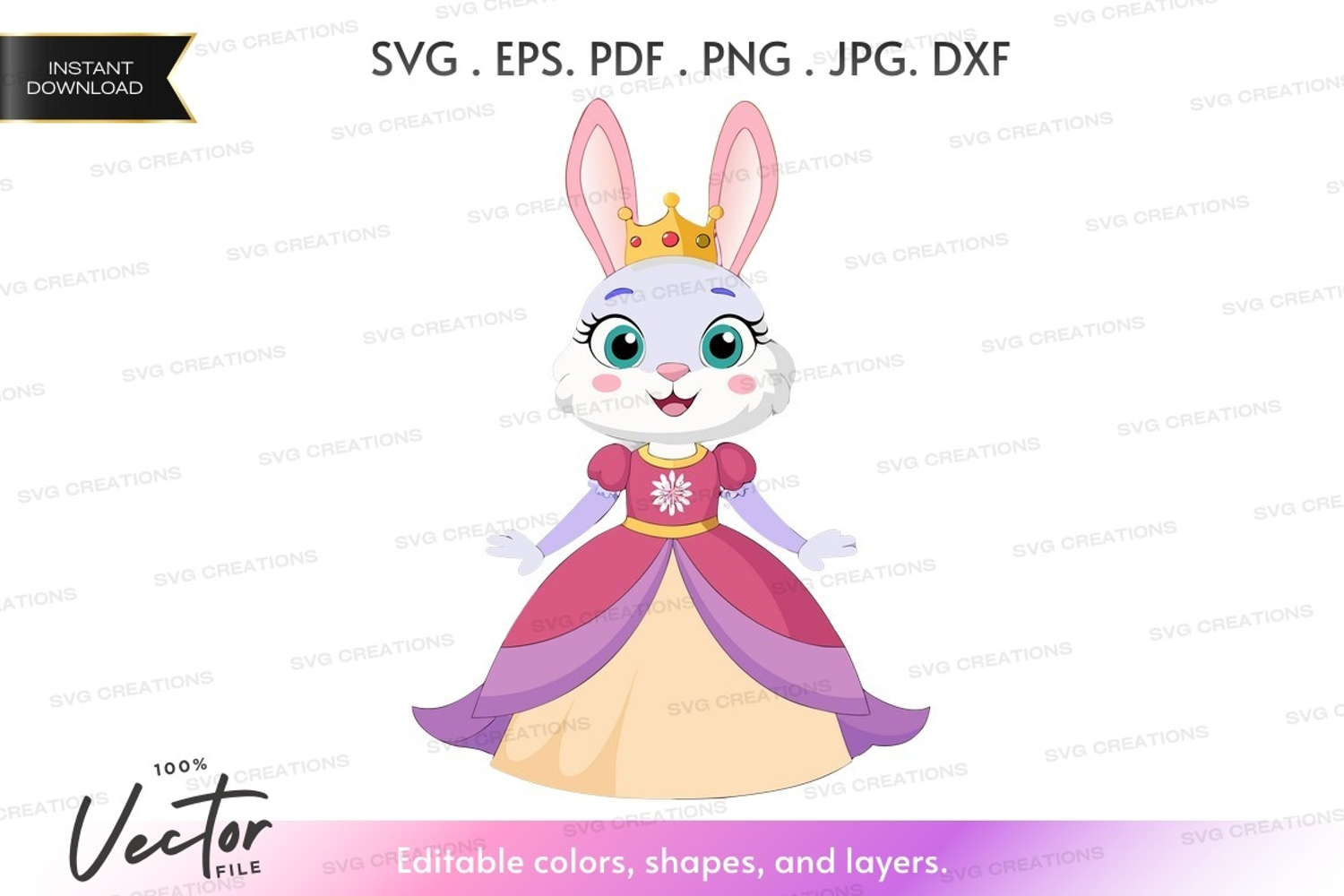 Elegant Pink Golden Purple Crown Bunny Princess Gown Whimsy Vector Silhouette