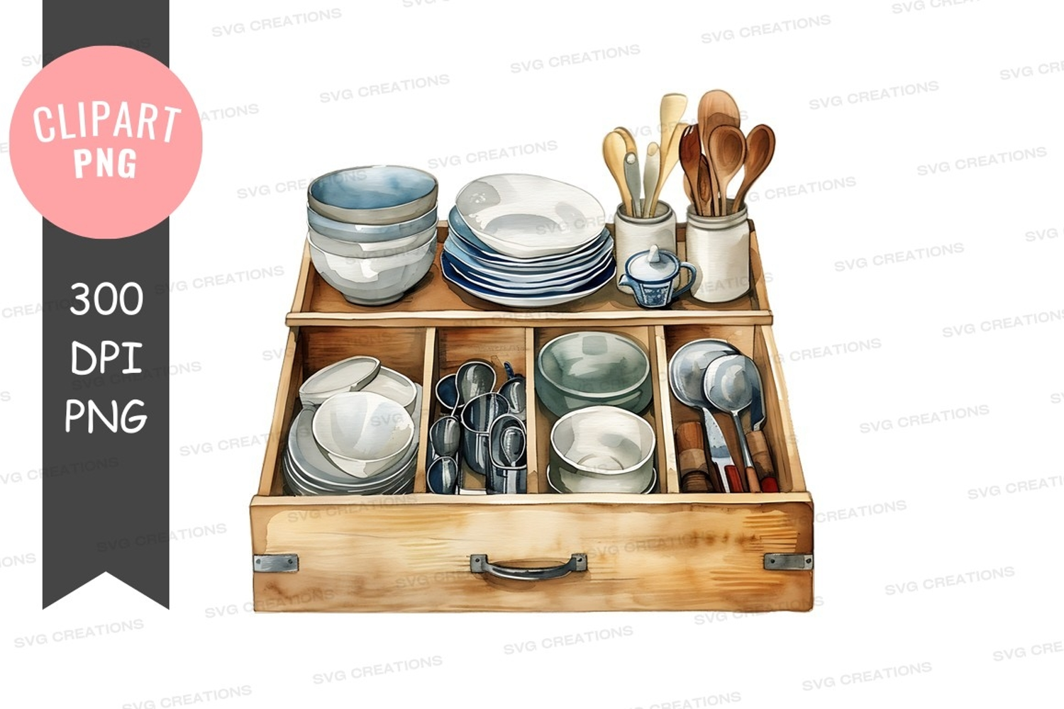 Clipart Png Kitchenware Utensils Wooden Box Cups Plates Bowls Dishes Spoons