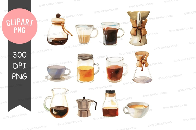 Illustration Watercolor Coffee Tea Brew Cups Tea Pot Pitchers Coffee Maker Infusers