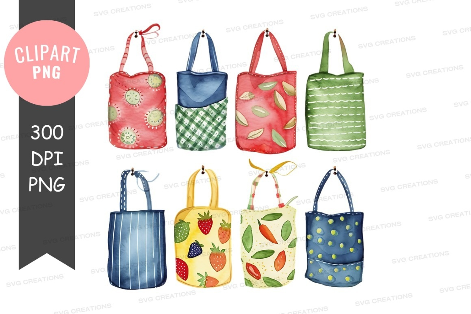 Assorted patterned tote bags clipart png example image 1