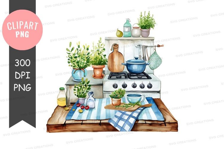 Cozy kitchen with herbs and utensils clipart png example image 1