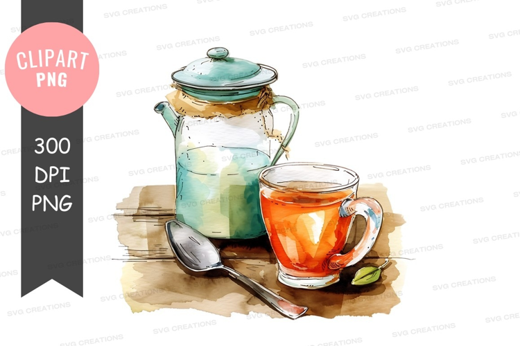 Illustration Watercolor Drink Tea Cup Teapot Spoon Tea Time Wooden Surface