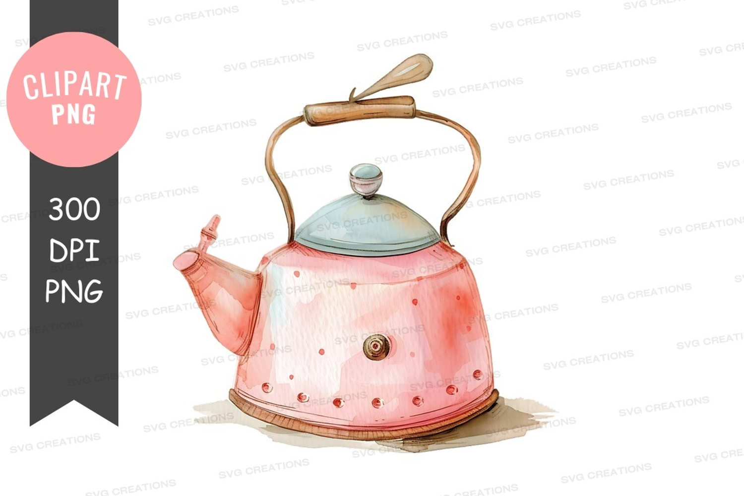 Watercolor Pink Clipart Transparent Background Kitchenware Teapot Polka Dots Wooden Handle