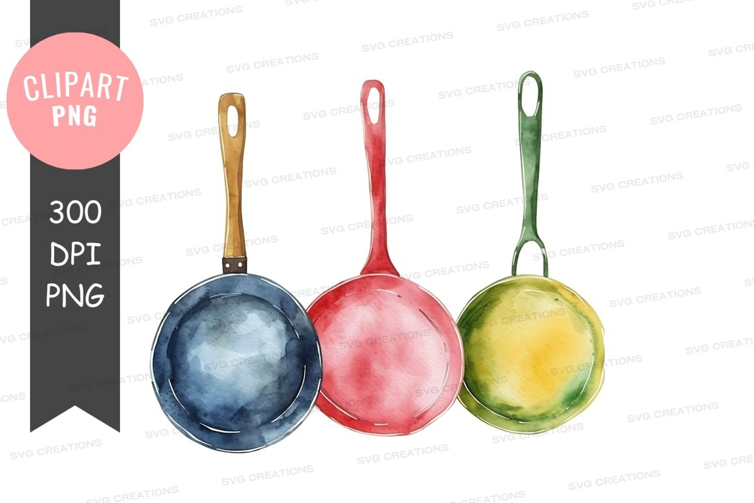 Watercolor Clipart Cooking Kitchen Cooking Utensils Handles Red Pan Frying Pans Blue Pan Green Pan