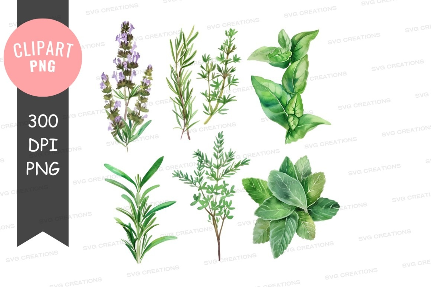 Watercolor Lavender Mint Basil Rosemary Herbs Sage Oregano Thyme Bay Leaves