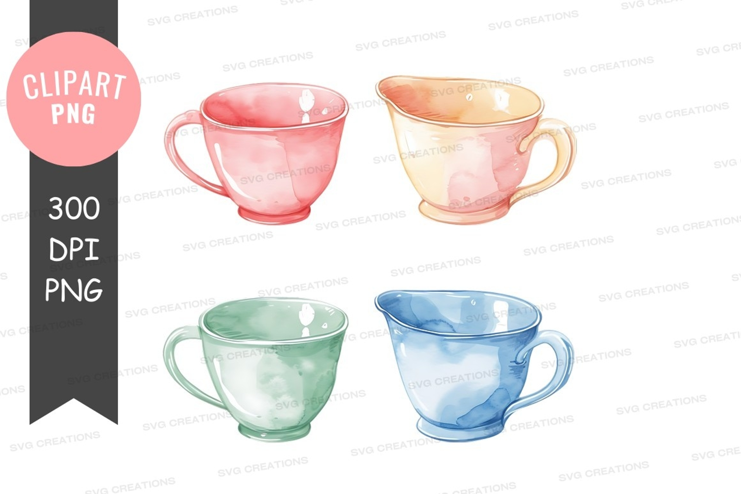 Watercolor Pink Green Clipart Blue Yellow Png Tea Cups