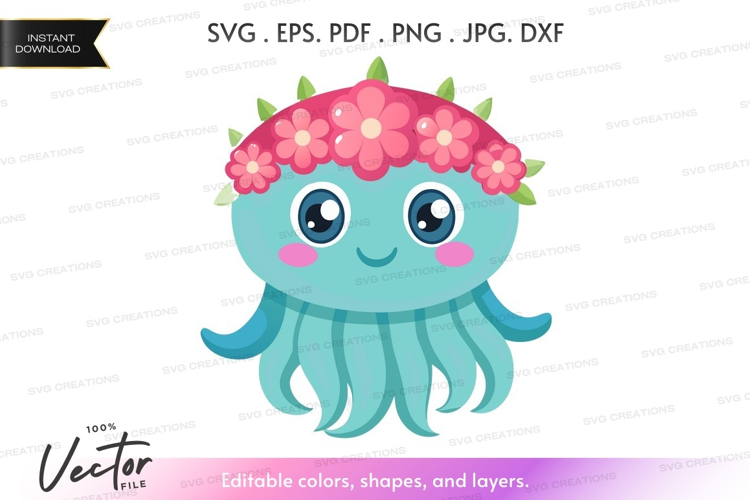 Cartoon Cute Pink Flowers Blue Sea Creature Jellyfish Happy Face Flower Crown