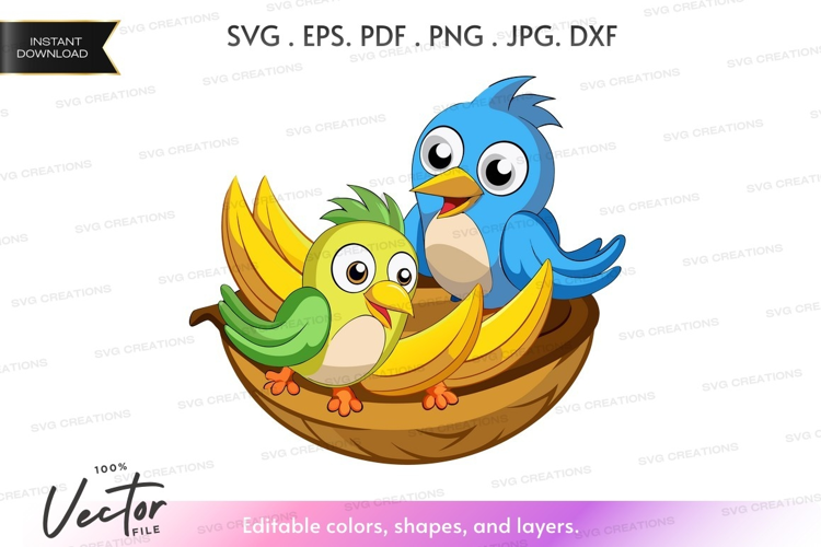 Cartoon Funny Animals Whimsical Birds Nest Bananas Expressive Eyes