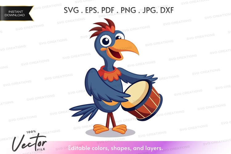 Cartoon Funny Animal Happy Bird Feathers Cheerful Musical Drum Drumming