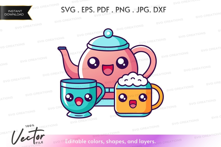 Cartoon Cute Tea Teapot Friends Tea Party Teacup Happy Faces