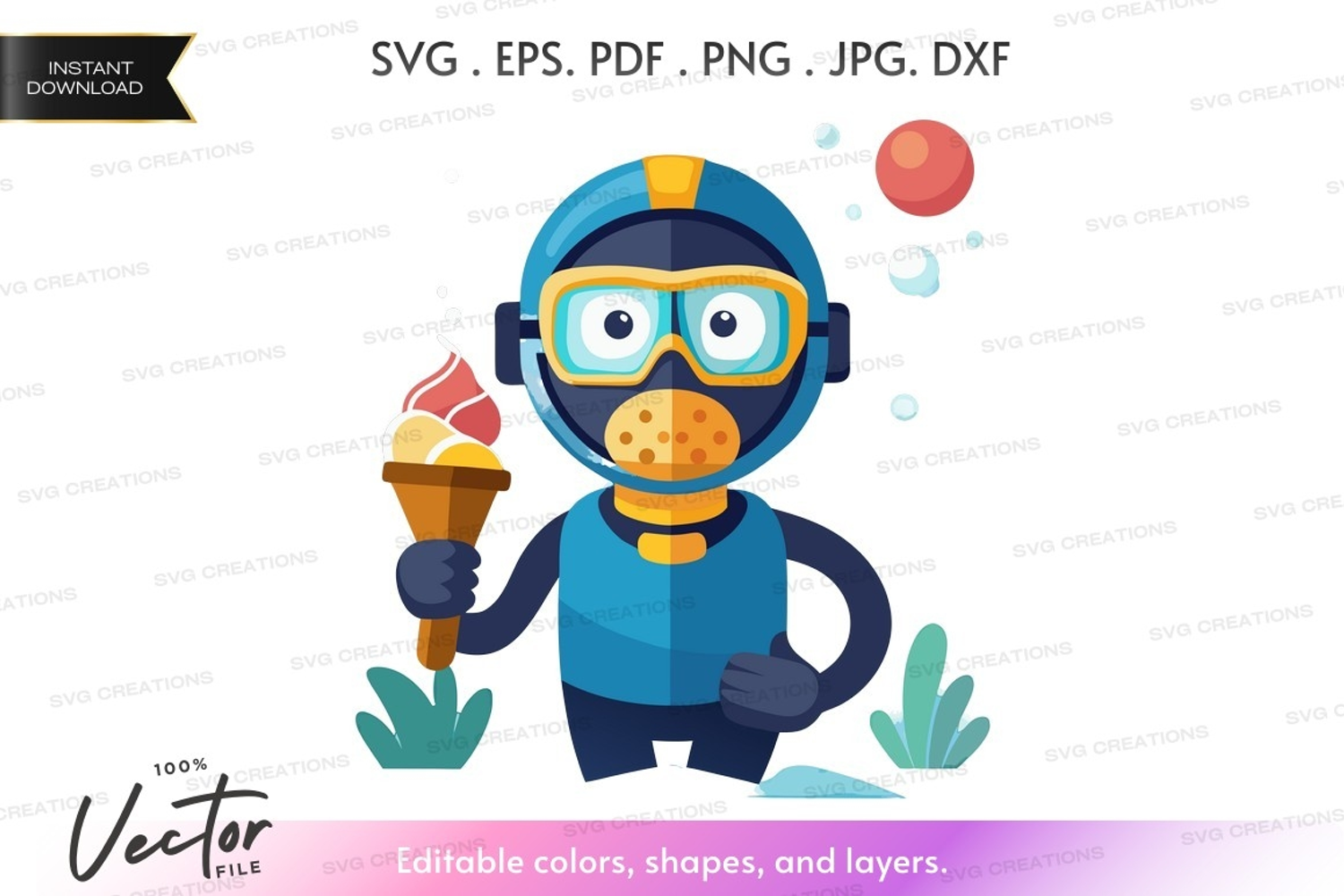 Cartoon Funny Sea Bubbles Underwater Ice Cream Vector Illustration Scuba Diver