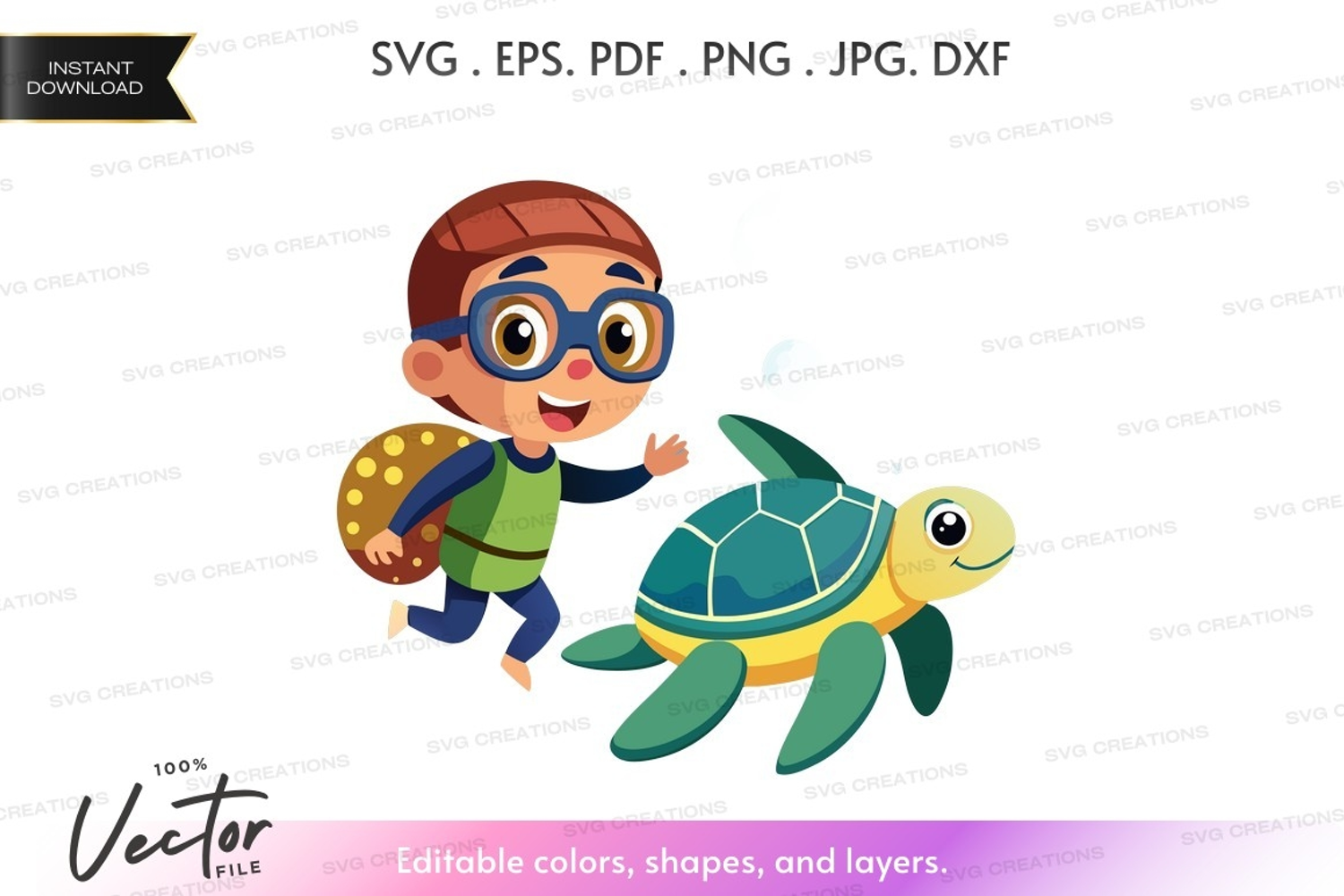 Friendly Boy Glasses Backpack Vector Clipart Running Turtle Green Shirt