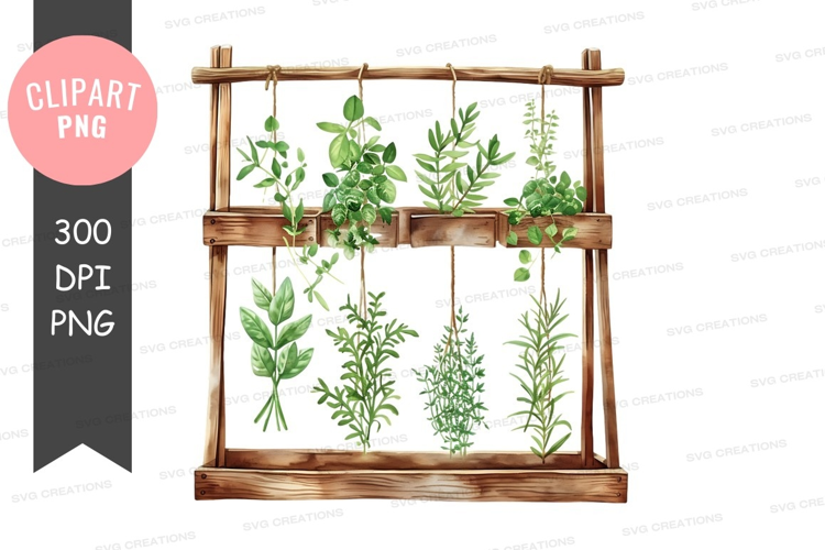 Watercolor Rustic Basil Rosemary Herbs Greenery Hanging Fresh Herbs Thyme Wooden Rack