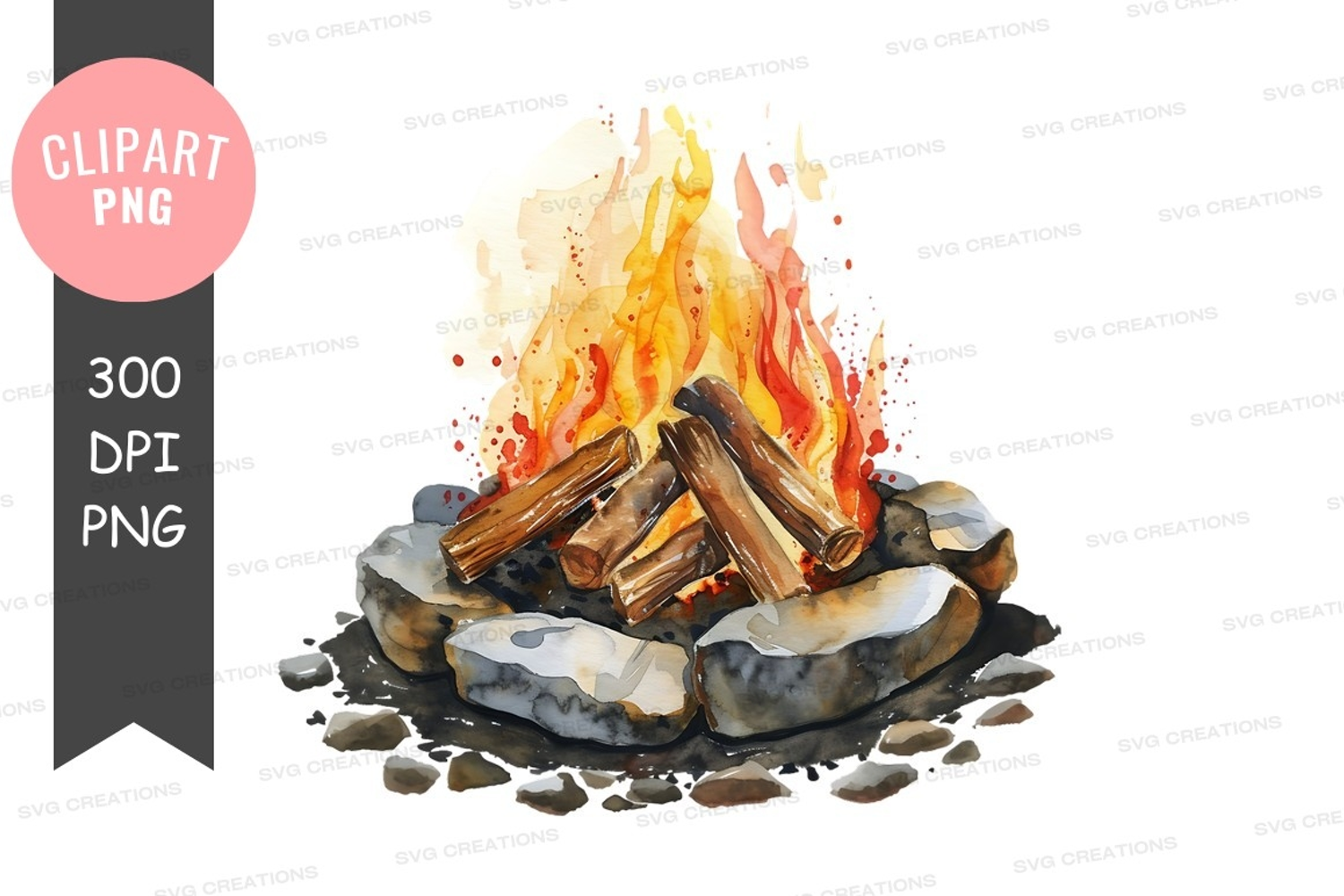 Illustration Watercolor Nature Outdoor Camping Fire Campfire Logs Rocks Flames