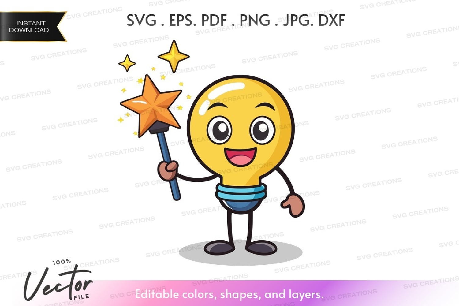 Character Cartoon Smile Happy Magic Idea Creativity Wand Light Bulb Sparkles