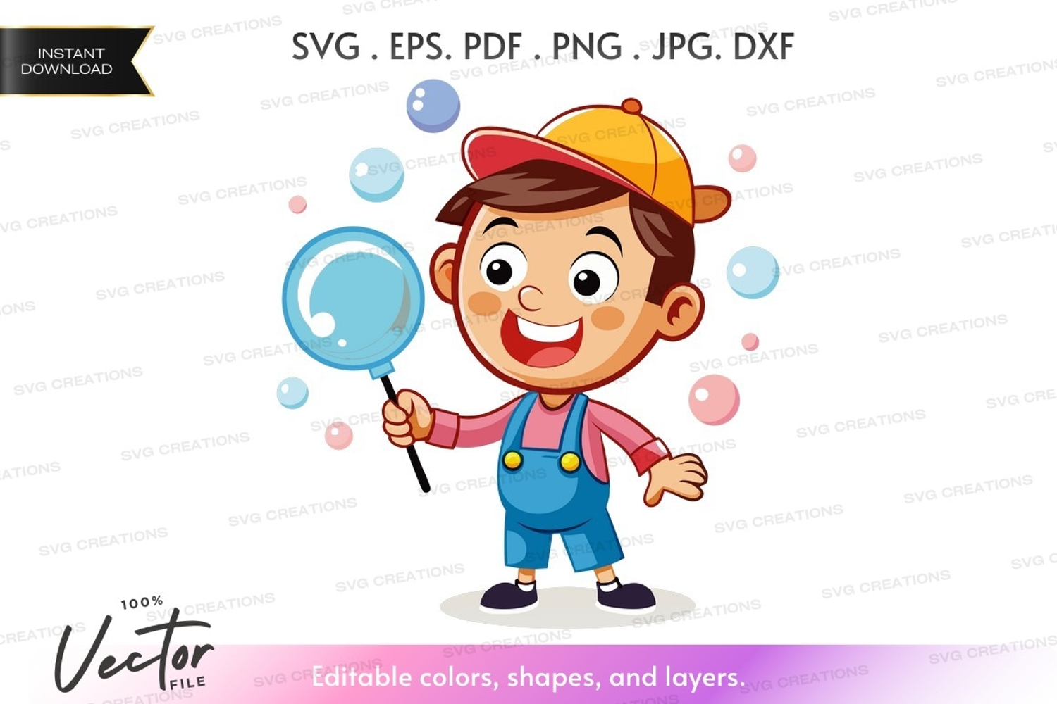Child Cartoon Playful Happy Boy Bubbles Explore Magnifying Glass Curious