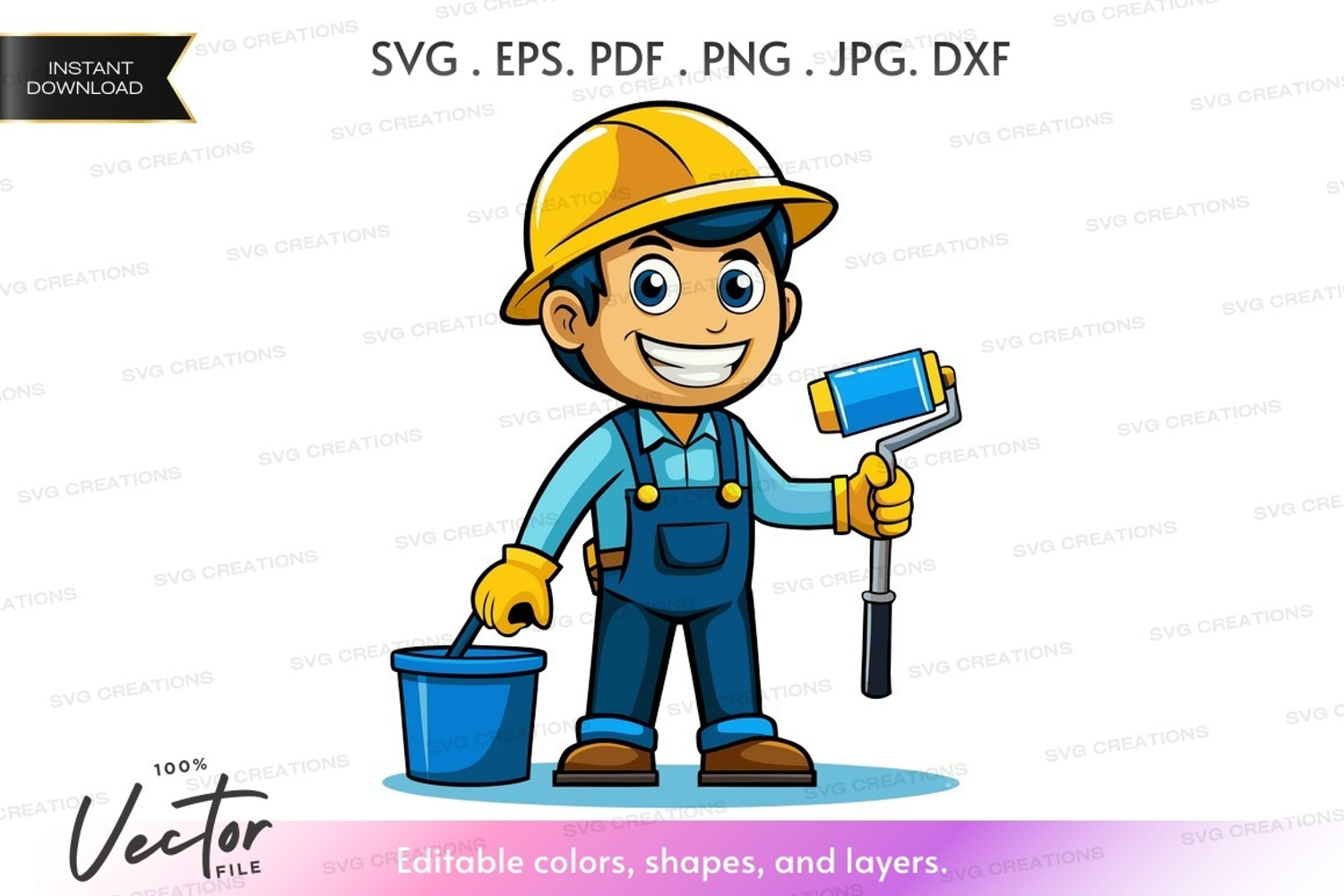 Cartoon Painting Happy Construction Painter Overalls Vector Clipart Paint Roller Bucket Hard Hat