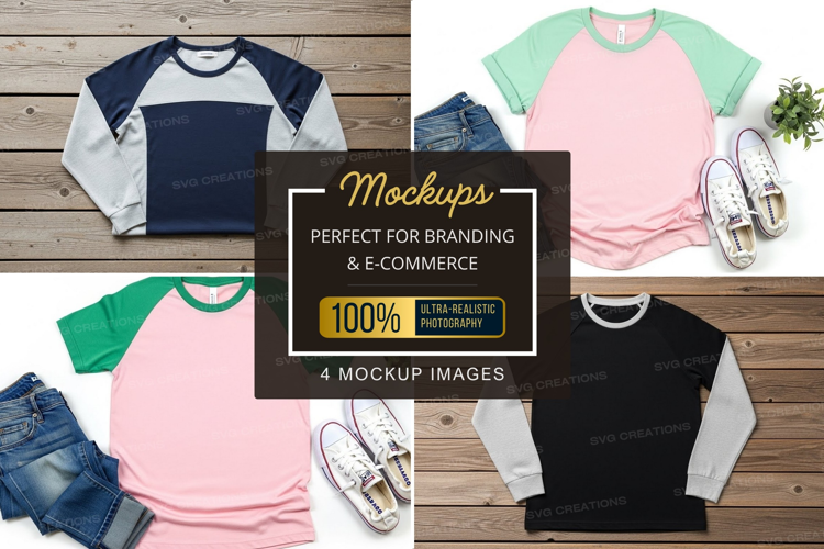 Fashion T-shirt Colorful Mockup Jeans Shoes Wooden Background Long-sleeve