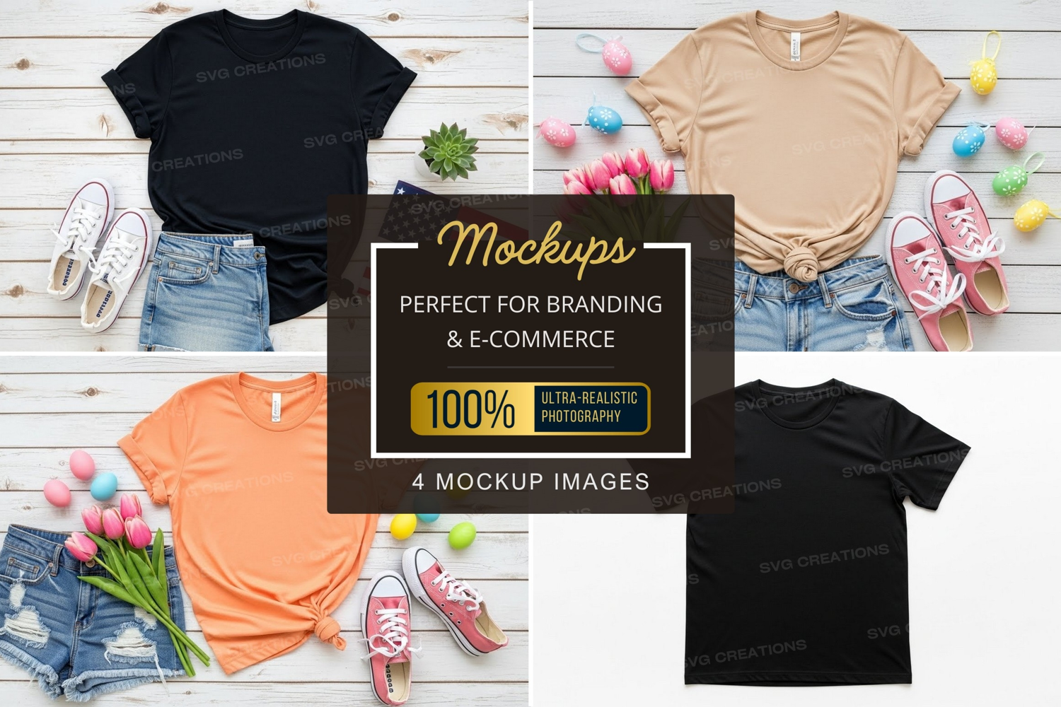 Black T-shirt Mockup Beige Easter Eggs Sneakers Tulips Spring Fashion Denim Shorts Casual Wear